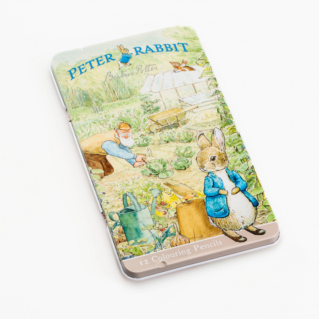 Metalleske med motiv av Peter kanin. Esken inneholder 12 fargeblyanter i klare farger.