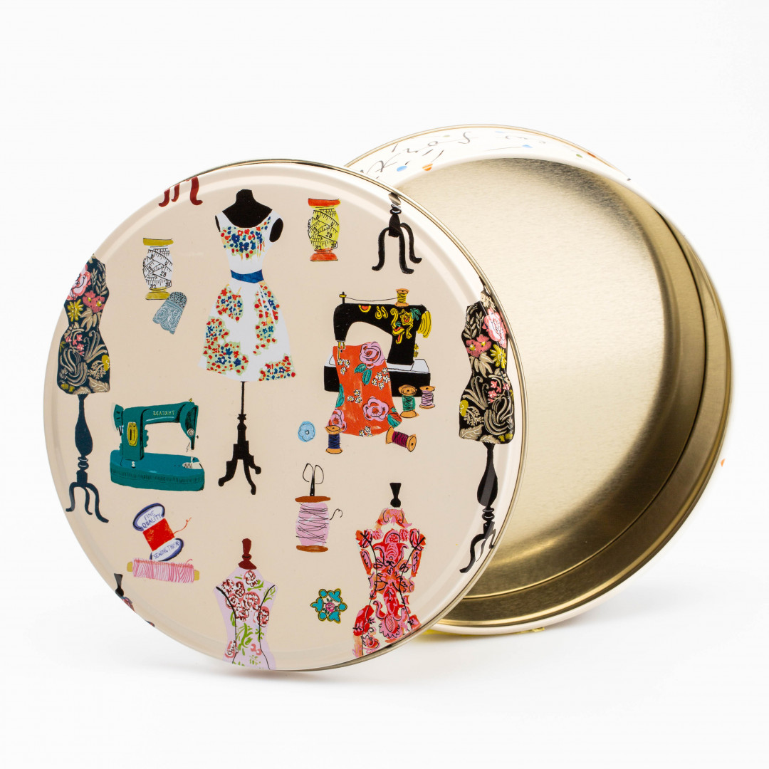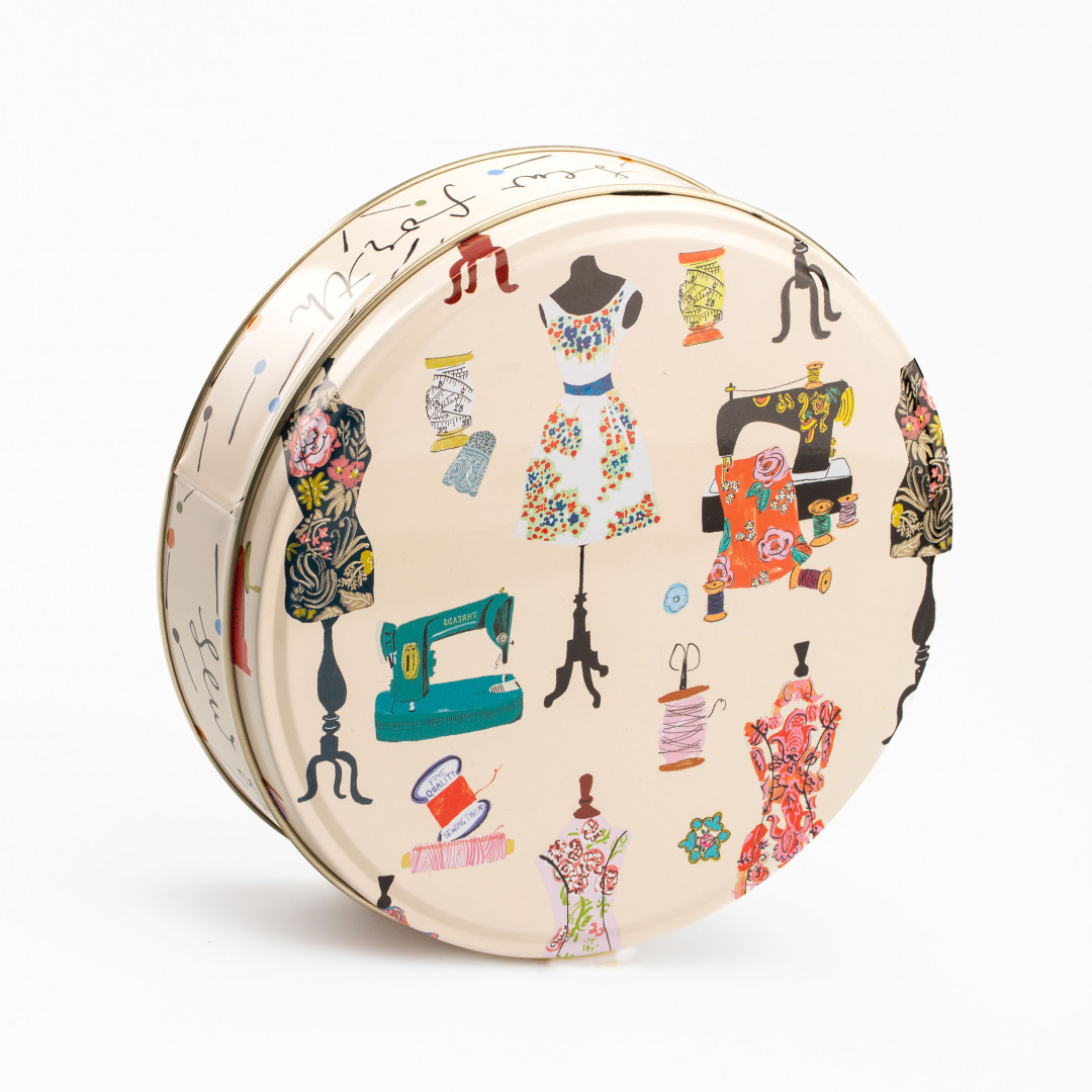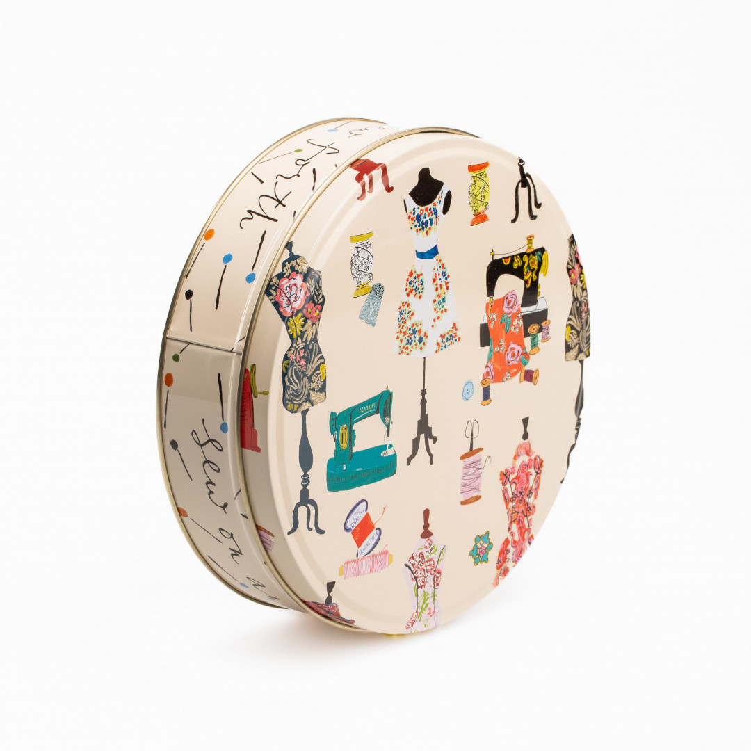 Rund metallboks med symotiv. Perfekt til å oppbevare sysaker som nåler. knapper og saks.