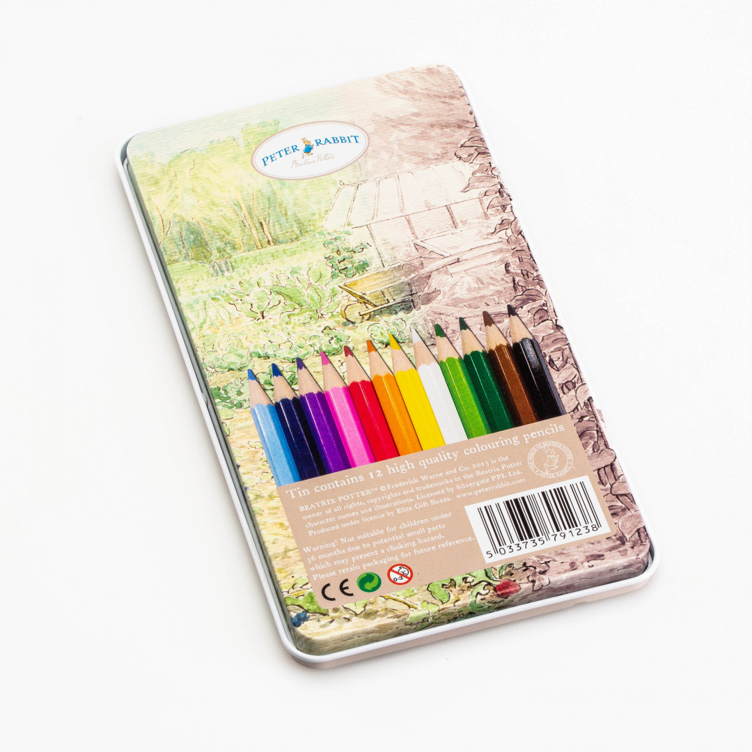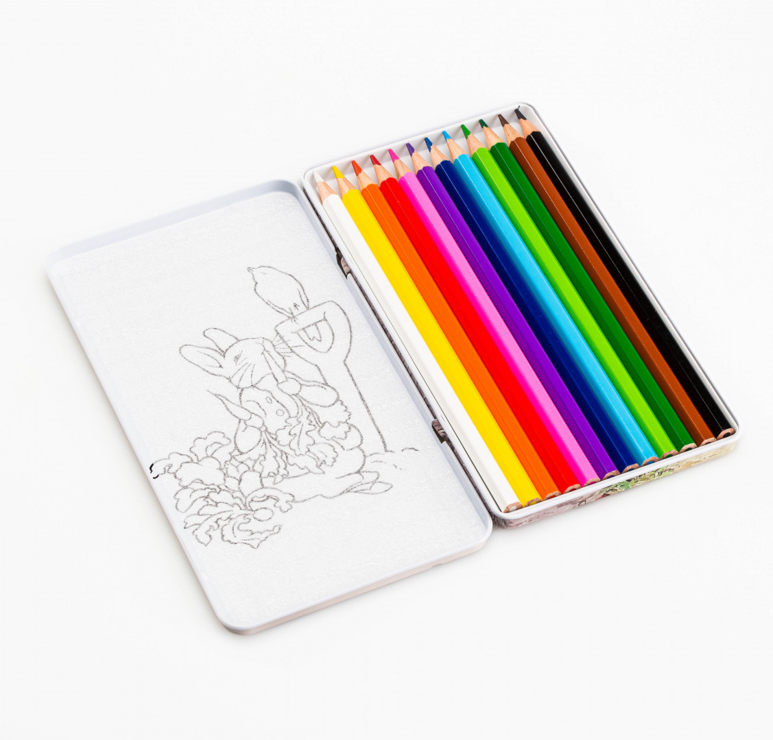 Metalleske med motiv av Peter kanin. Esken inneholder 12 fargeblyanter i klare farger.