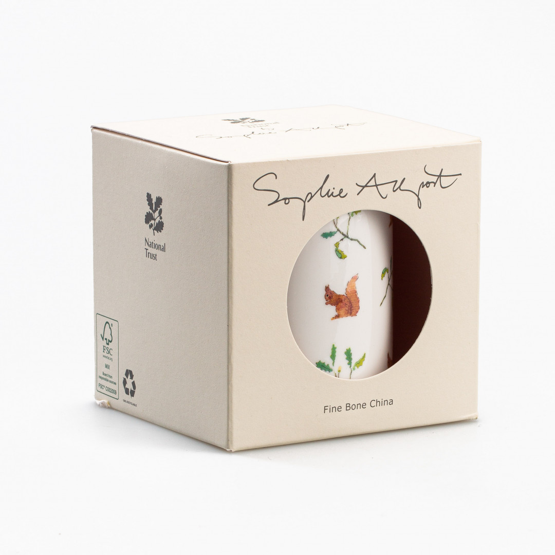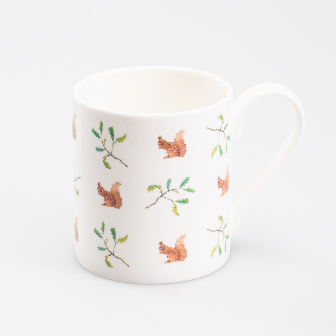 Krus i hvitt benporselen fra britiske Sophie Allport med koselig motiv av ekorn og løvblader.